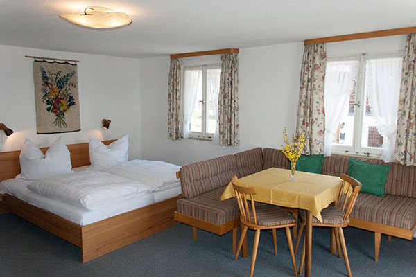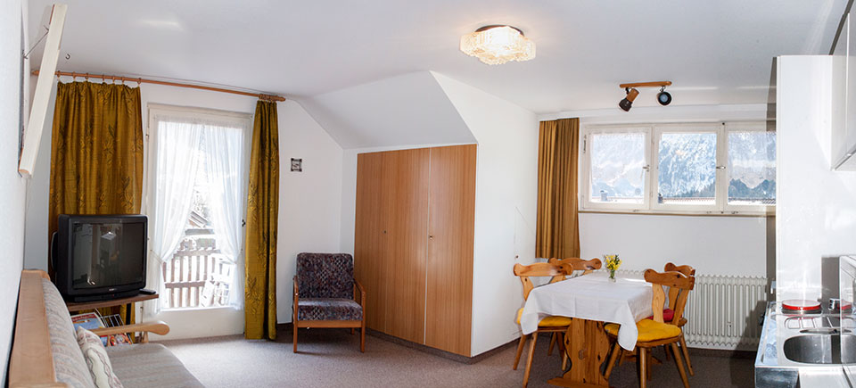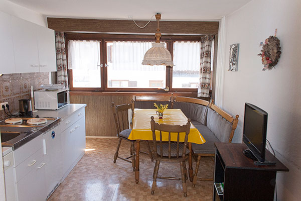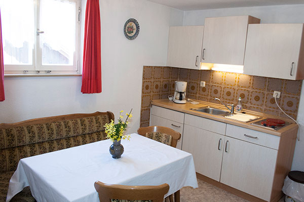 Wohnung 1 ist ca. 50 m² und für bis zu bis 4 Personen. Sie hat ein Schlafzimmer, ein Wohnschlafzimmer, eine Wohnküche mit Mikrowelle sowie DU/WC.